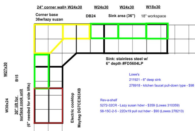 The corner base lazy susan's interior hardware will be replaced with a Rev-A-Lock 5272-32CR metal lazy susan hardware kit. The 15" wide base unit next to the cooktop will be outfitted with a Rev-A-Lock 5WB2-1111-CR, 11-3/4" x 22" two shelf pull out hardware unit.