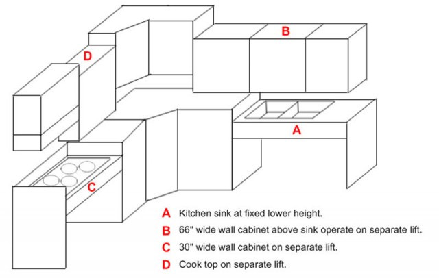 Our design includes (A) lowering the kitchen sink and using a sink that is only six inches deep. The kitchen faucet has a removeable sprayer and a lever for water temperature. The 66" wide wall cabinet group above the sink (B) will raise and lower, using two 9-inch vertical height electric lifts. The 30" wide wall cabinet near the cooktop (C) will raise and lower 18 inches, using one lift. The cooktop will raise and lower on a separate lift pair. The school has a separate kitchen, in which they can teach oven cooking skills.