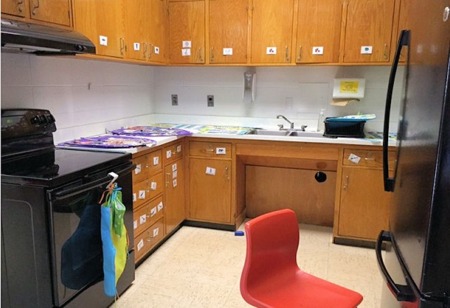 Here is a "before" picture of a kitchen in a transition skills training program. The previous kitchen has a open area for kitchen sink wheelchair access. Overall, this kitchen is not very wheelchair accessible.